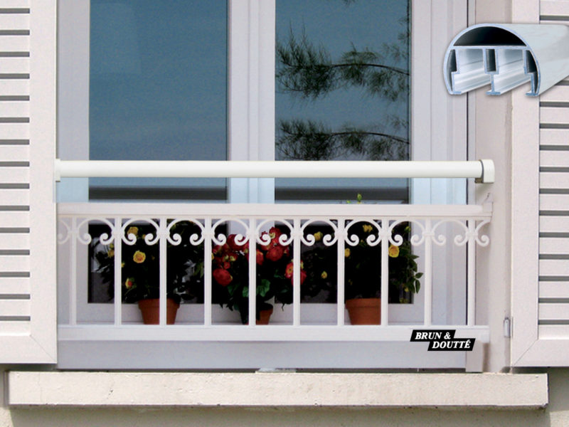 Hauteur 35 cm, avec main courante hauteur totale de 46 à 50 cm et largeur sur mesure. Traverses horizontales en profilé aluminium section 30 x 24 mm. Panneaux décoratifs formant volutes en fonte d’aluminium.