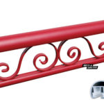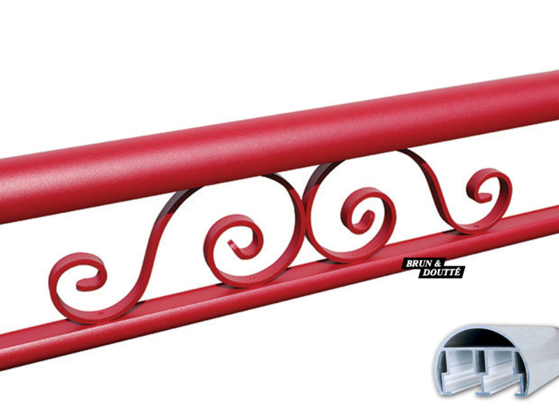 Hauteur 17 cm, main courante demi rond 55 x 39 mm et largeur sur mesure. Lisse basse ø 30 mm en profilé aluminium, volutes décoratives en aluminium.