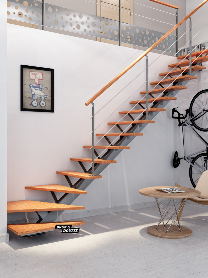 Escalier BROOKLYN compatible avec les rampes et garde-corps d’étage New York, Boston, Oléron, Rivoli, Broadway, Philadelphie, d’Atelier et Melun (uniquement 4 lisses parallèles sur les rampants, voir rubrique Rampes et Garde-corps d’escaliers d’intérieur).