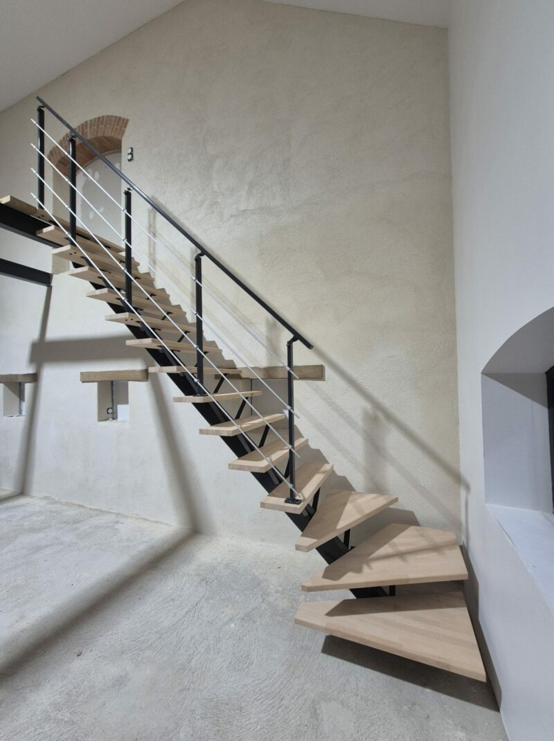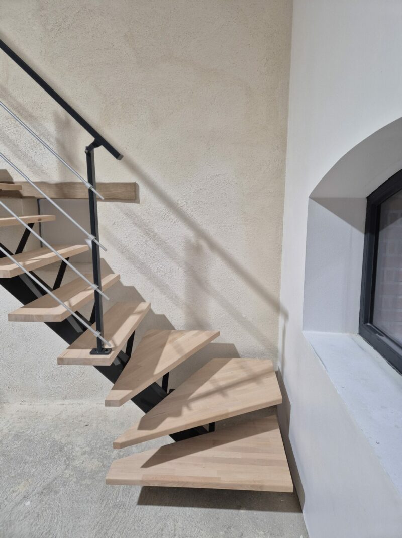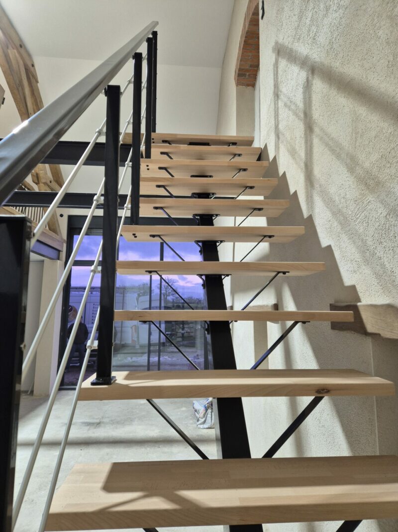 Escalier acier à limon central, marches hêtre naturel lamellé-collé épaisseur 34 mm, largeur de volée standard 85 cm, autres largeurs possibles de 75 à 90 cm sur devis. Pour un escalier standard de 14 marches, hauteur à monter comprise entre 267,1 cm et 285,0 cm, autres escaliers possibles entre 12 à 18 marches pour des hauteurs à monter de 228,1 cm à 361,0 cm.