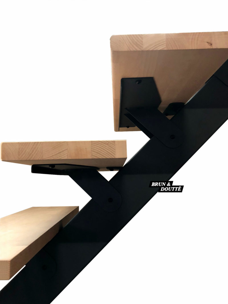 Escalier acier à limon central, marches hêtre naturel lamellé-collé épaisseur 34 mm, largeur de volée standard 85 cm, autres largeurs possibles de 75 à 90 cm sur devis. Pour un escalier standard de 14 marches, hauteur à monter comprise entre 267,1 cm et 285,0 cm, autres escaliers possibles entre 12 à 18 marches pour des hauteurs à monter de 228,1 cm à 361,0 cm.