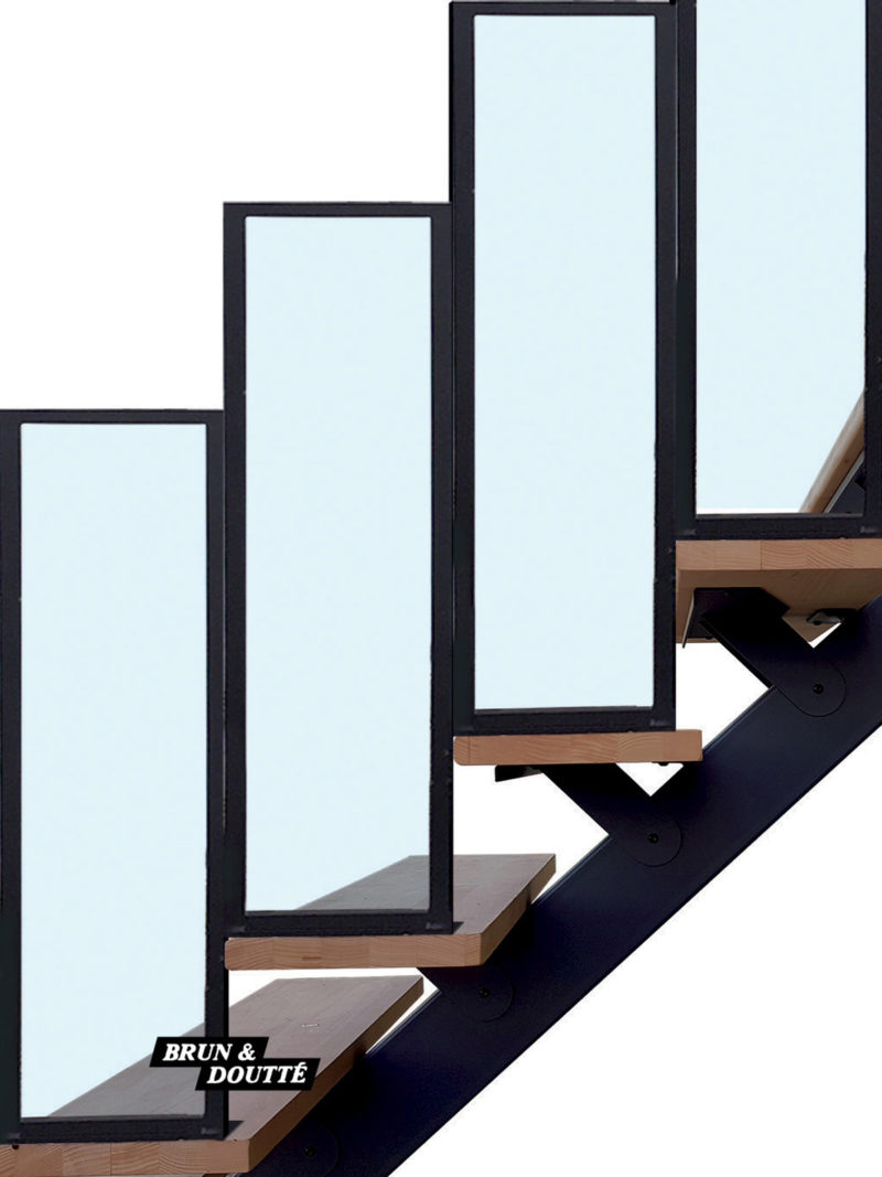 Détail rampe d’escalier d’Atelier, pose sur marche, finition noir ral 9005 grainé