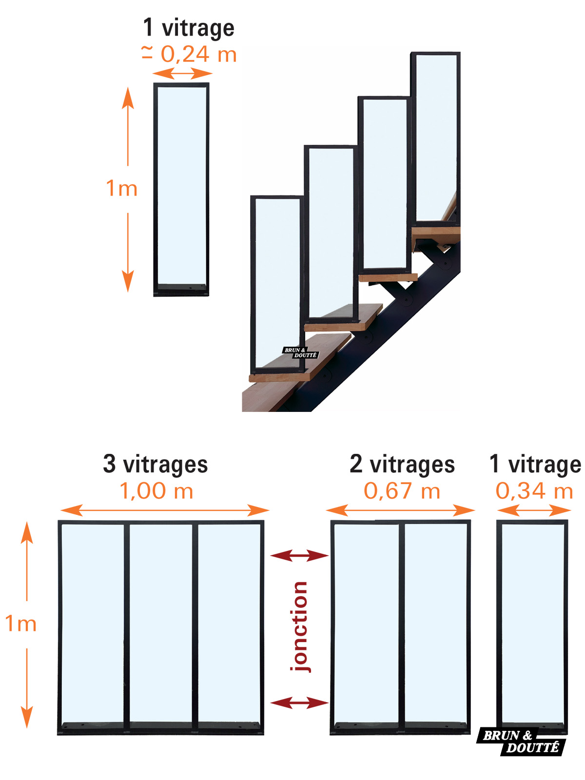 Composé d’une structure en acier de 30 mm, vitrage feuilleté 33/2 mm épaisseur 6 mm sécurité des personnes, vitrage transparent, possibilité vitrage granité, opale, fumé, coloré ou dépoli en option.