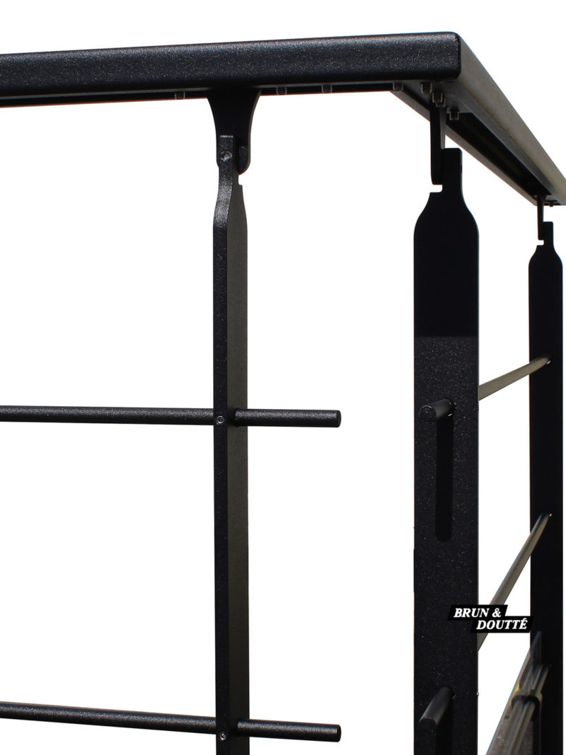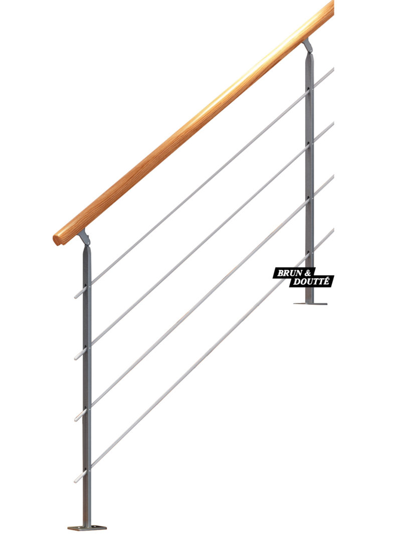 Composé de poteaux en fer plein, main courante tubulaire largeur 50 mm ou bois en option et lisses en aluminium anodisé, 4 lisses pour le rampant et 5 lisses pour le garde-corps d’étage.