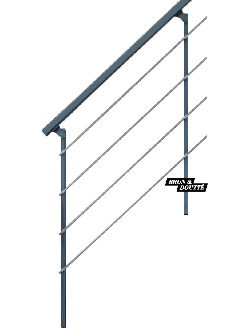 Pose sur platines sur dalle ou à l’anglaise. Installation simple et rapide grâce aux systèmes de réglage. Serrage manuel des câbles inox sans pince à sertir. Hauteur de balcon règlementaire 1 m. Rampe 4 lisses uniquement en rond plein ø 12 mm.Garde-corps extérieur acier