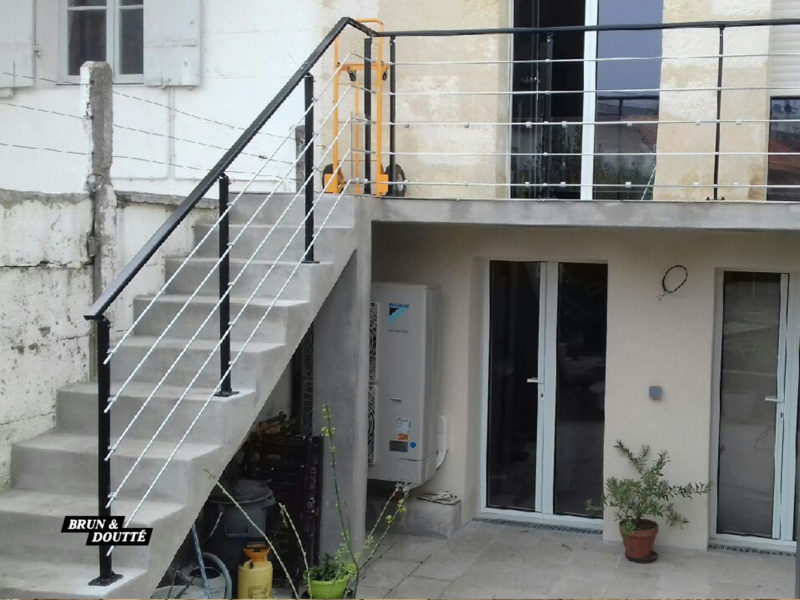 Garde-corps acier composé d’éléments comprenant main courante tubulaire acier largeur 50 mm, barreaux acier en rond plein ø 12 mm et câbles inox ø 4 mm, poteaux ouvragés en fer plein.