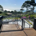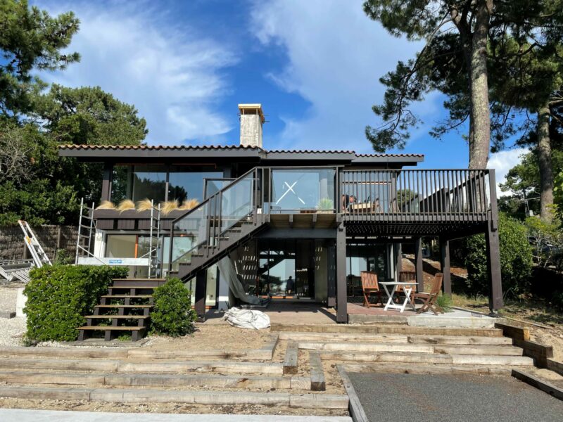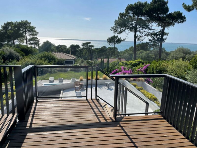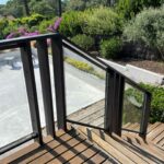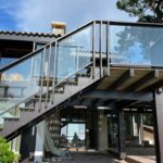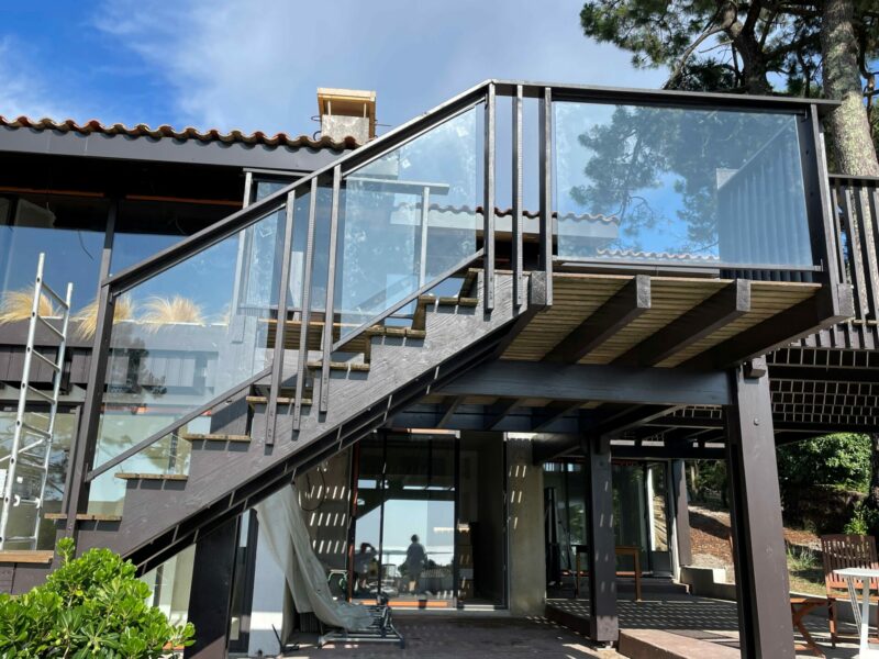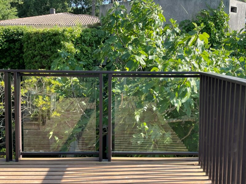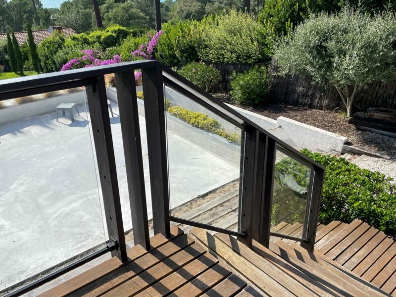 Garde-corps acier composé de poteaux en fer plein, main courante largeur 25 mm et panneaux transparents en verre feuilleté 44/2 épaisseur 8 mm à chants polis.