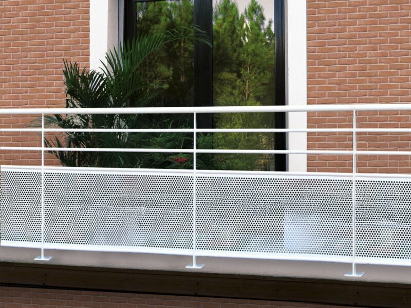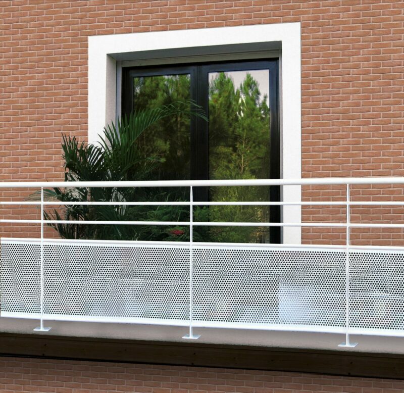 Lisses hautes et bassse et remplissage en tôle acier Léopard. Pose sur platines sur dalle ou à l’anglaise. Installation simple et rapide grâce aux systèmes de réglage. Hauteur de balcon réglementaire 1 m.Rampe 4 lisses uniquement en rond plein ø 12 mm.