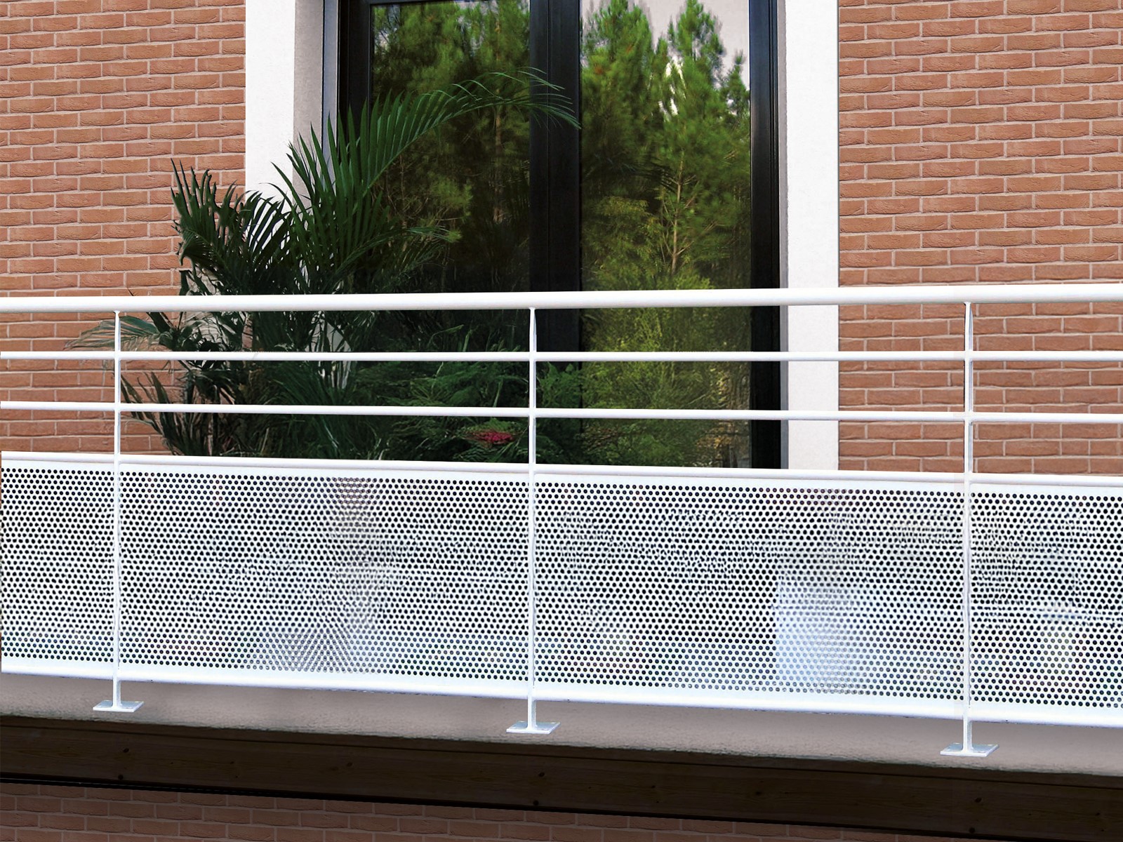 Installation simple et rapide grâce aux systèmes de réglage. Hauteur de balcon règlementaire 1 m.Rampe 4 lisses uniquement en rond plein ø 12 mm.