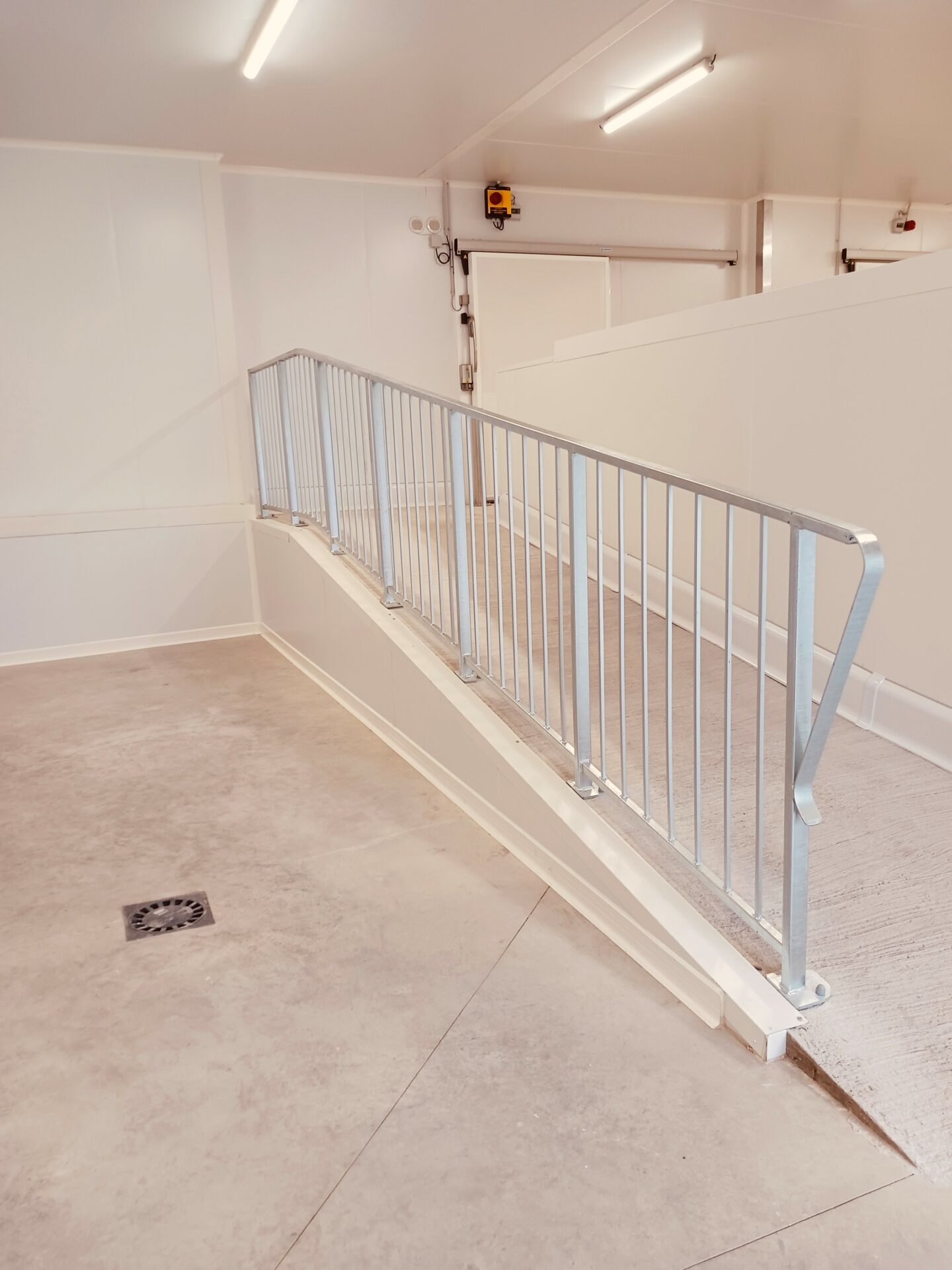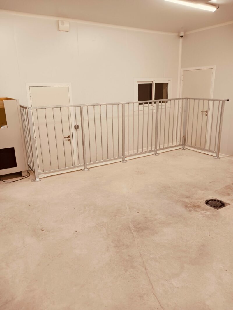 Garde corps acier composé d’éléments comprenant main courante tubulaire acier larg. 50 mm, poteaux en fer plein.