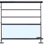 Composé d’éléments comprenant des poteaux en fer plein, main courante ronde ø 45 mm ou bois exotique en option, et lisses horizontales rondes ø 18 mm (2 lisses pour le garde corps et 4 lisses pour la rampe), soubassement en verre feuilleté transparent 44/2 épaisseur 8 mm, hauteur 45 cm.