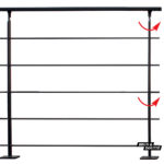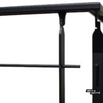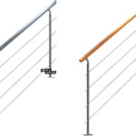 Composé de poteaux en fer plein, main courante tubulaire largeur 50 mm ou bois exotique en option et 5 lisses horizontales en aluminium anodisé (rampe 4 lisses).