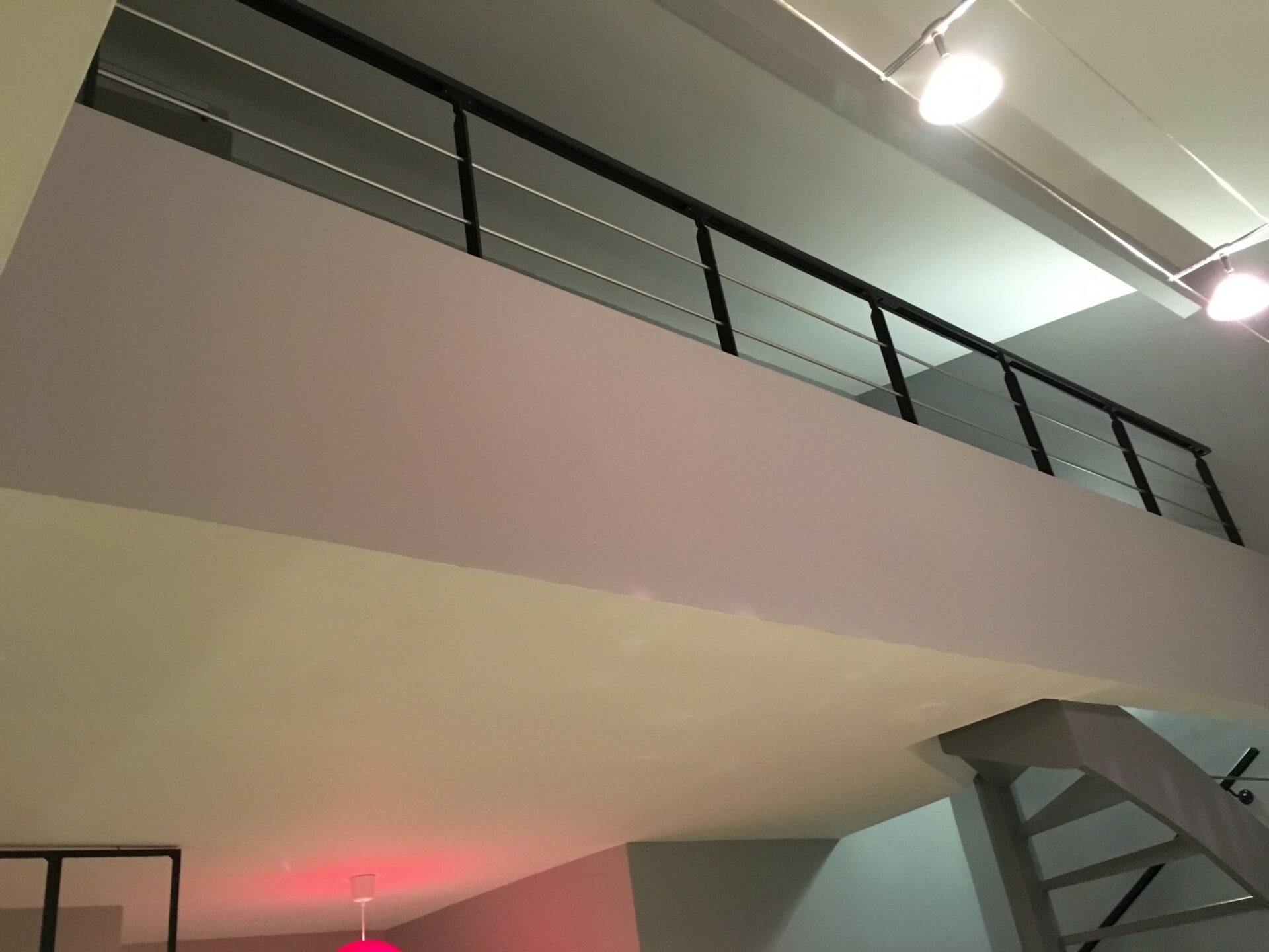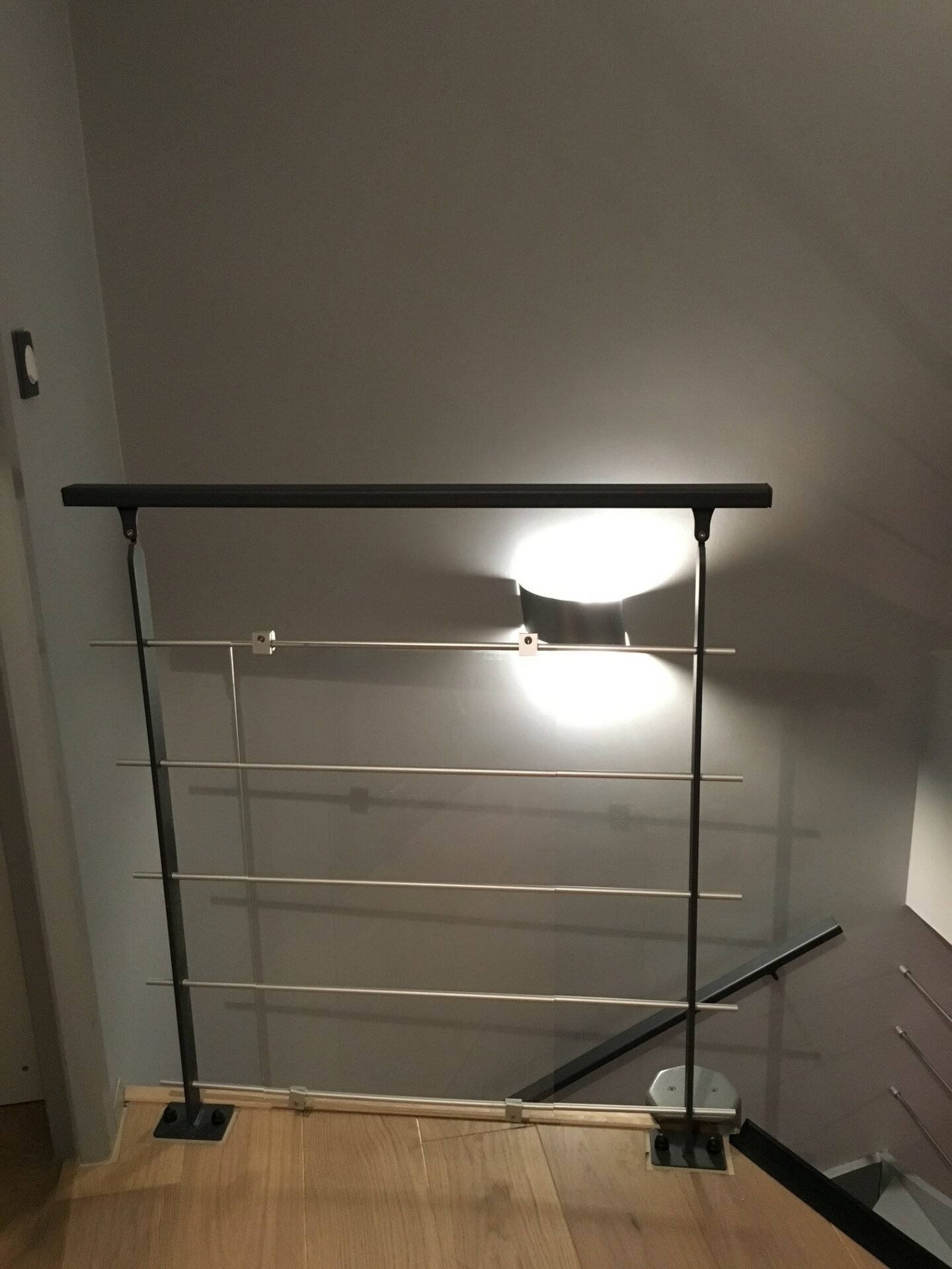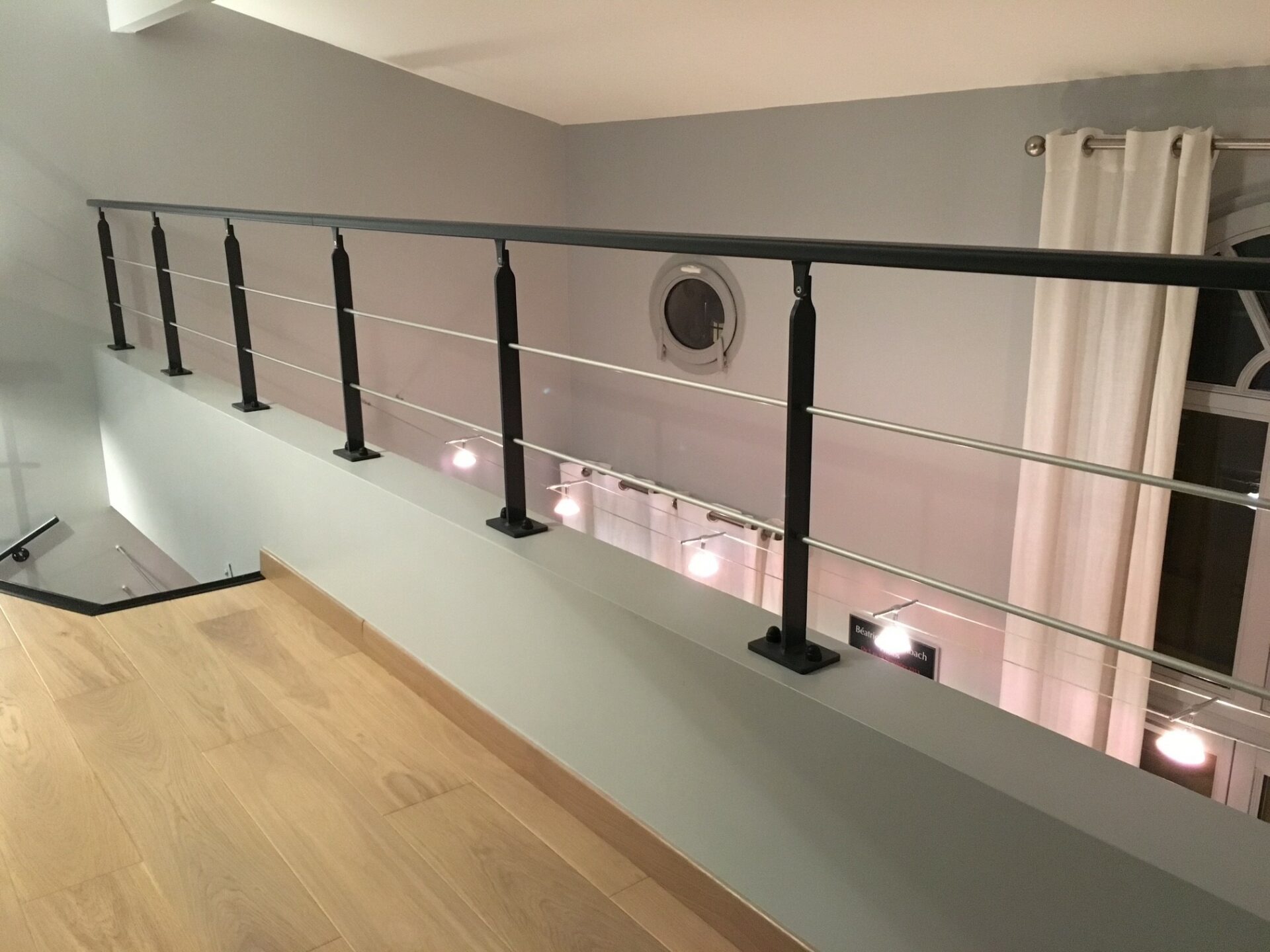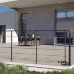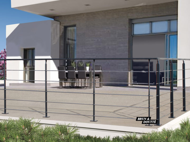 Composé de poteaux en fer plein, main courante tubulaire largeur 50 mm ou bois exotique en option et 5 lisses horizontales en aluminium anodisé (rampe 4 lisses).