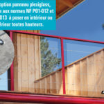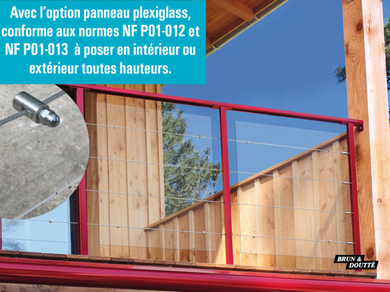 Possibilité fixation panneaux plexiglass hauteur 80 cm x longueur 90 cm x épaisseur 4 mm avec 4 fixations inox sur câbles, conformes aux normes de sécurité NF P01-012 et NF P01-013.