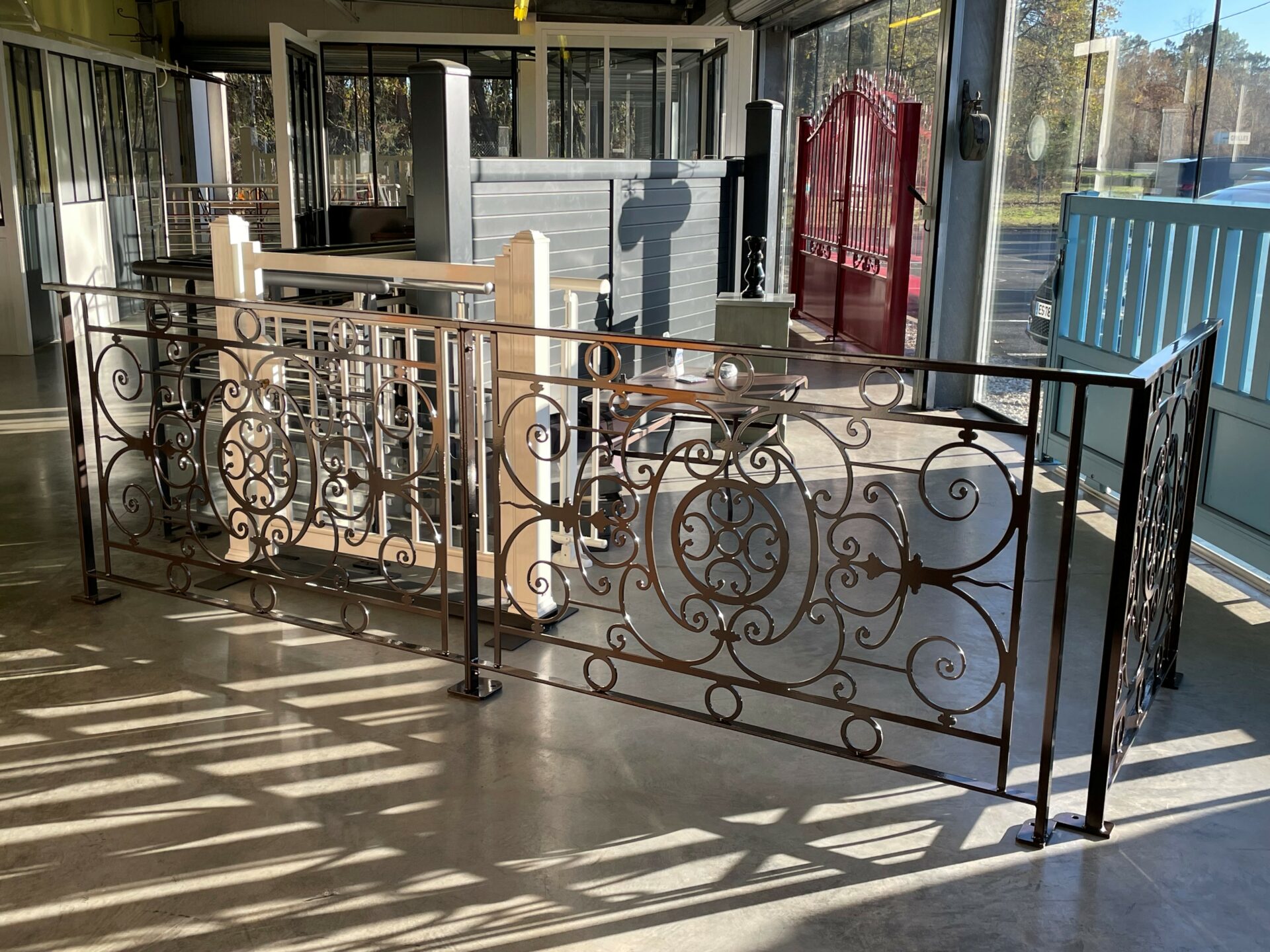Poteaux et traverse basse en fer plein, motif en fer plein ouvragé.