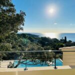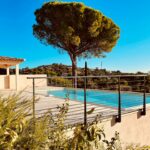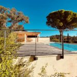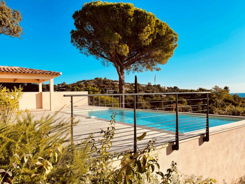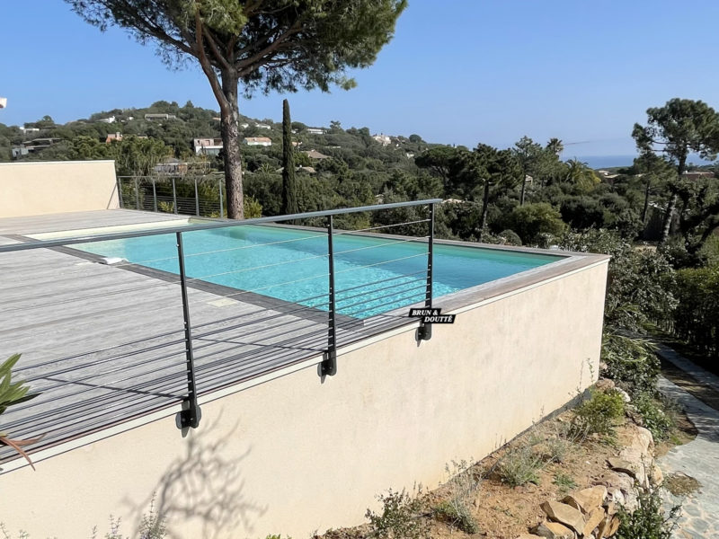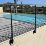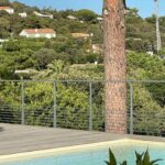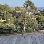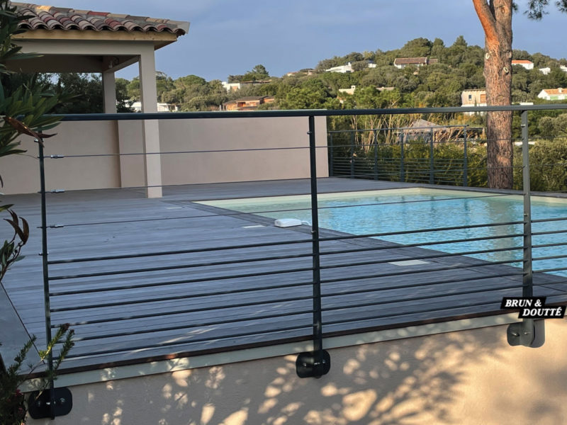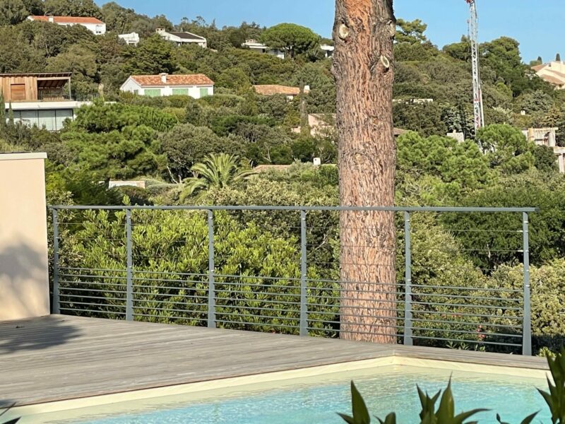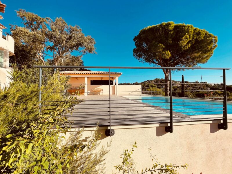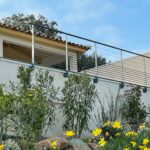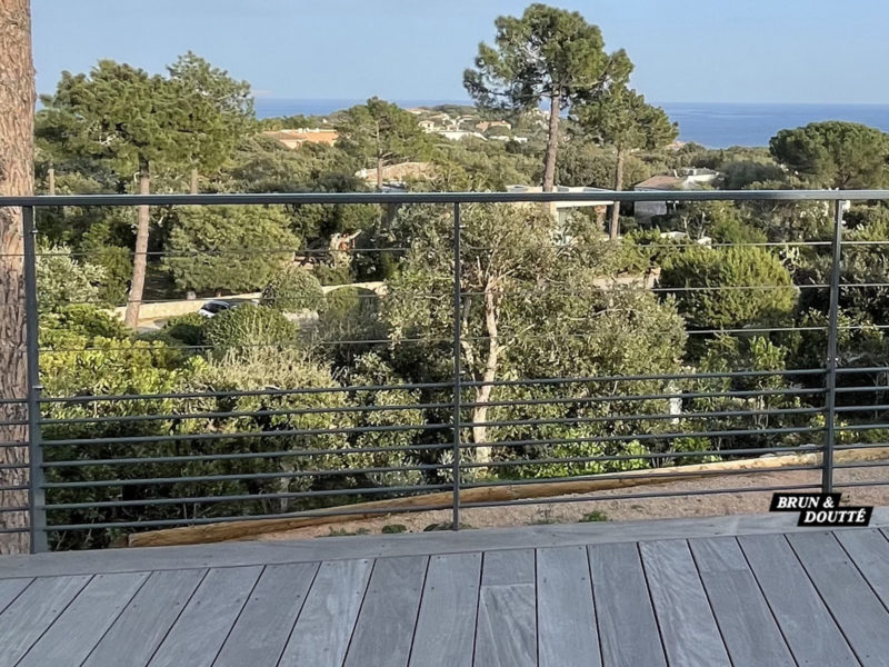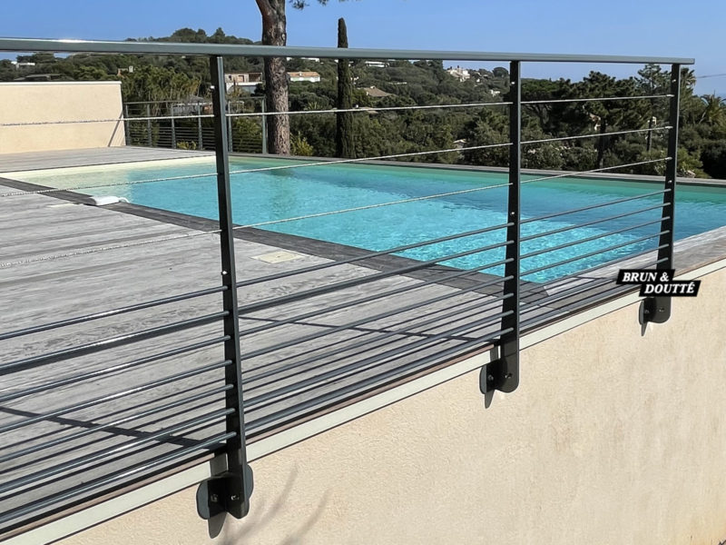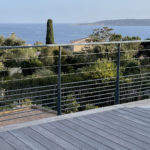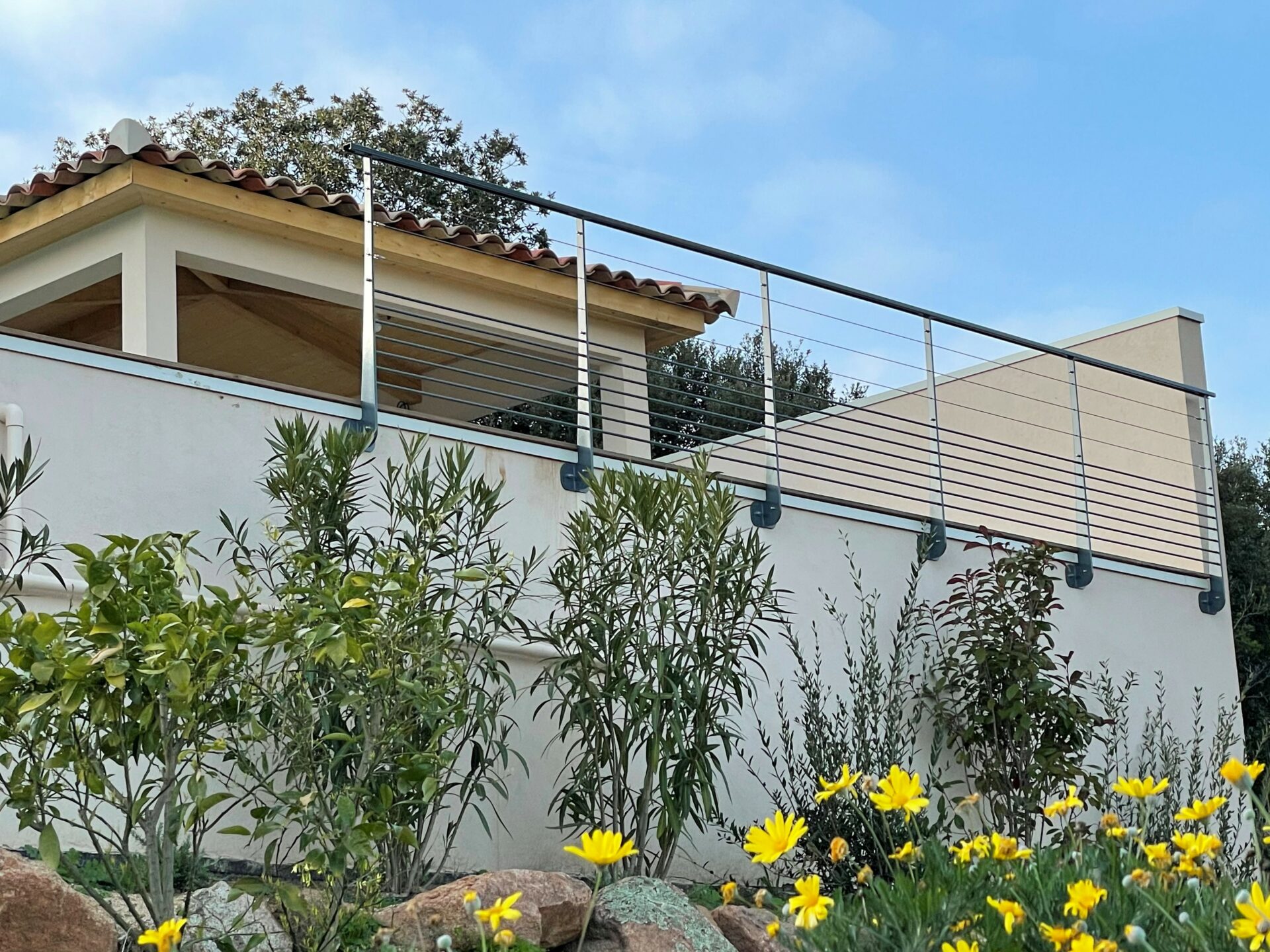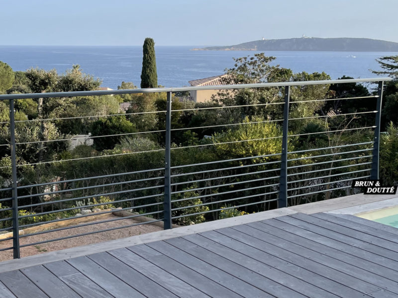 Garde-corps acier composé d’éléments comprenant main courante tubulaire acier largeur 50 mm, barreaux acier en rond plein ø 12 mm et câbles inox ø 4 mm, poteaux ouvragés en fer plein.