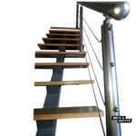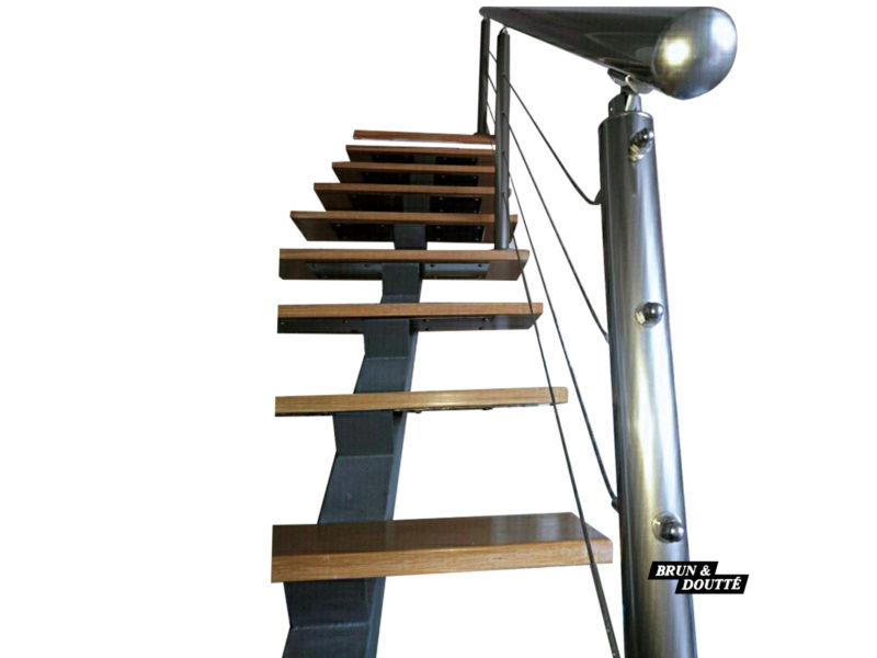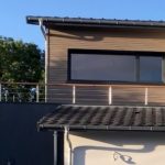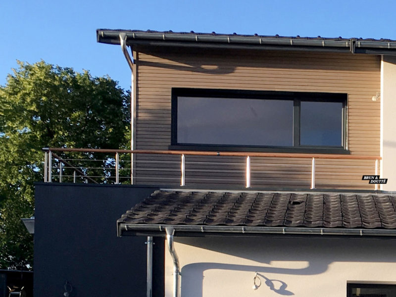 Garde-corps aluminium aspect inox composé de poteaux en tube rond ø 42 mm, d’une main courante ø 50 mm et 4 câbles inox ø 4mm.