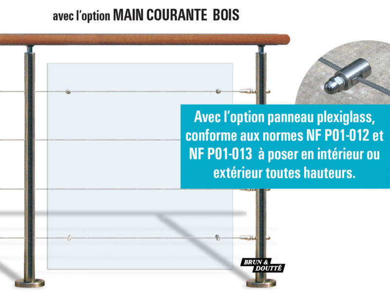 Tous nos garde-corps sont soumis au test de résistance et, avec la fixation panneaux plexiglass épaisseur 4 mm avec 4 fixations en inox sur câbles : hauteur 80 cm x longueur 90 cm, sont conformes aux normes de sécurité NF P01-012 et NF P01-013 toutes hauteurs.