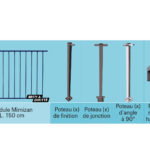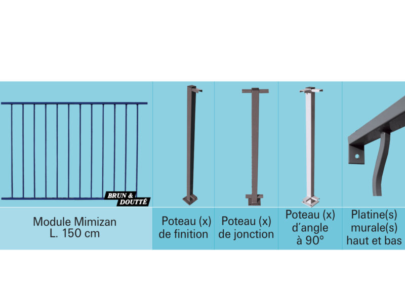 Modules acier longueur 1,5 m composés de lisses haute et basse en tube rectangle de 40 x 20 mm et barreaudage droit en carré plein de 12 x 12 mm. Poteaux sur platines en tube carré de 40 x 40 mm : poteau de finition, poteau de jonction ou poteau d’angle à 90° ou platine murale, comprenant emboîtages et bouchons en polypropylène.