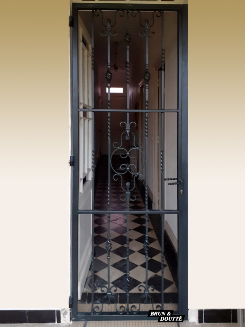 Ossature en tube de 40 x 40 mm, barreaudage en carré plein de 14 x 14 mm, traverses en plat de 30 x 8 mm, organes de rotation par gonds, serrure clefs plates, poignée.
