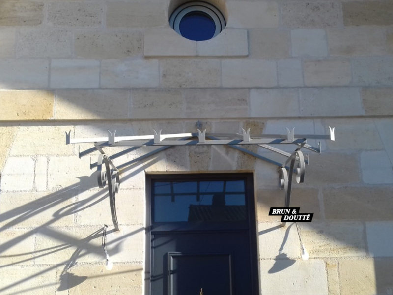 Cornière et fer à TE de 30 mm, arrêts de verre, consoles et volutes en fer plat de 30 x 8 mm.