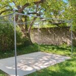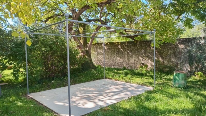Ossature en tube rond de 42 mm, finition boules et volutes forgées sur les poteaux d’angle.