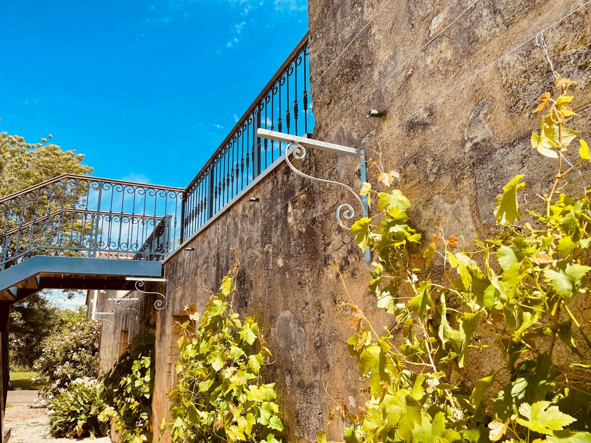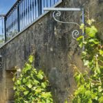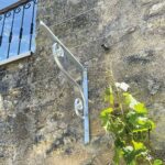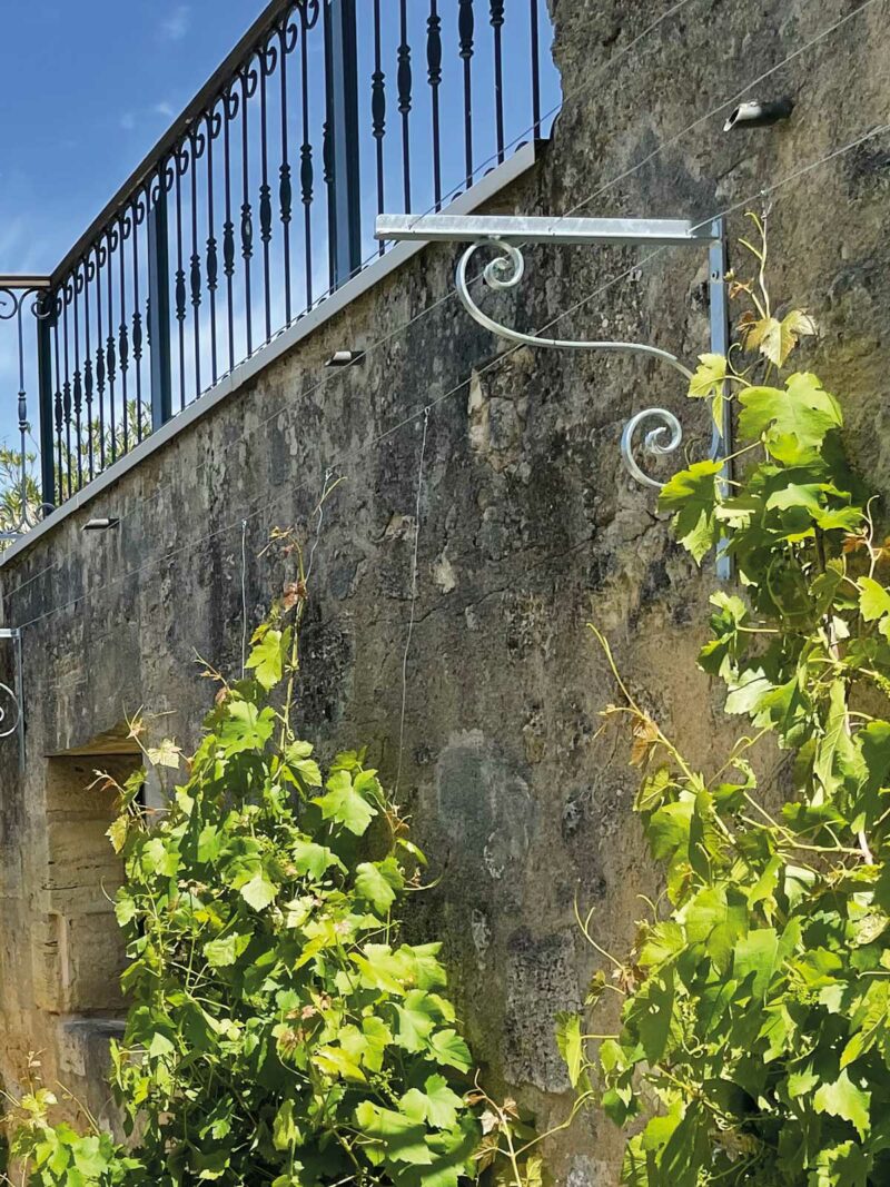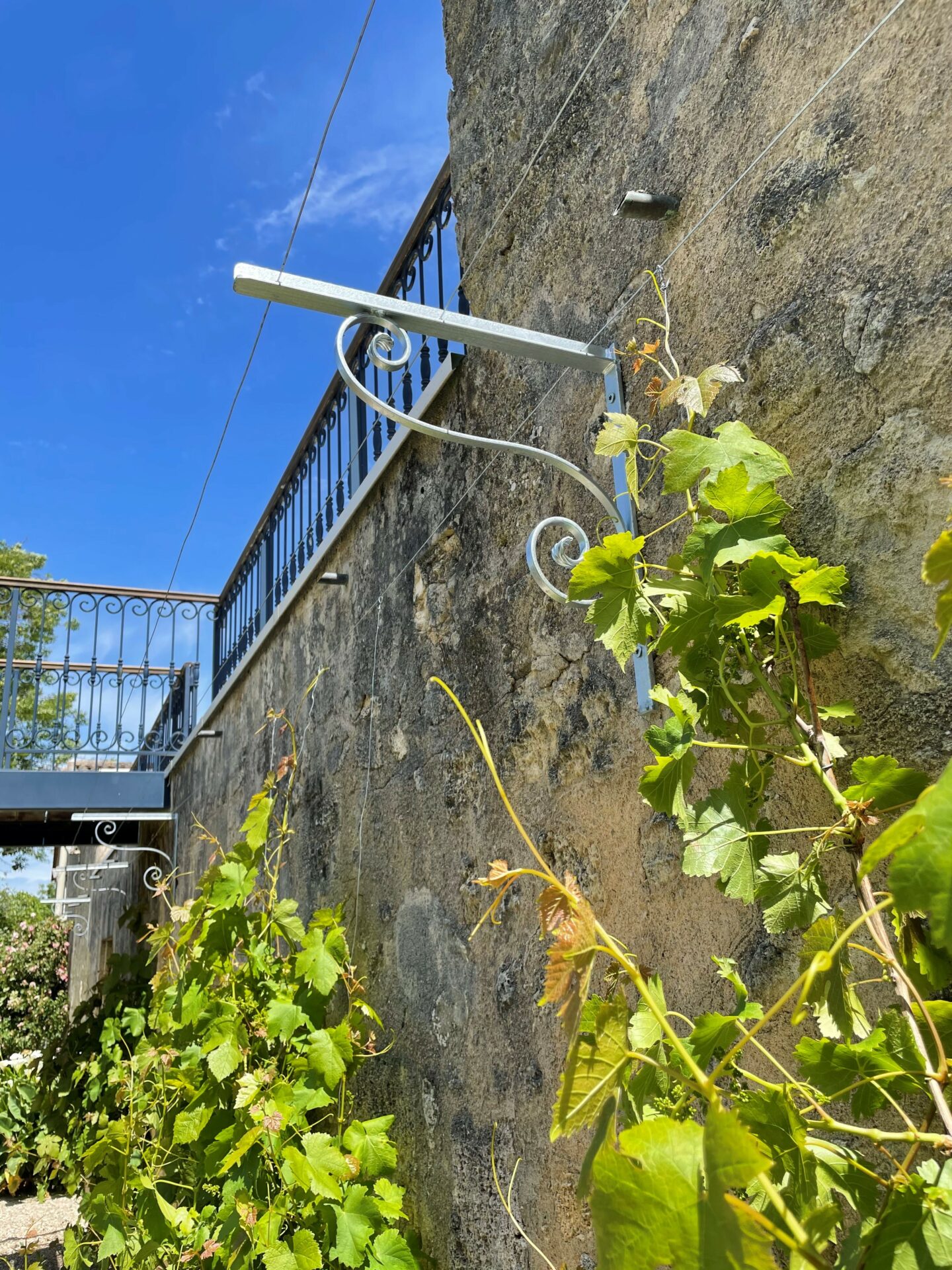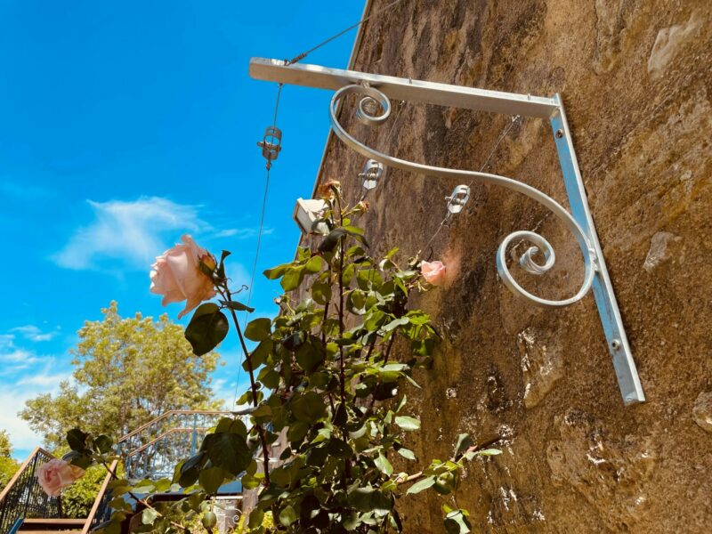Structure en fer plat et cornière montée sur volute en fer forgé.