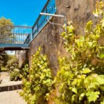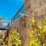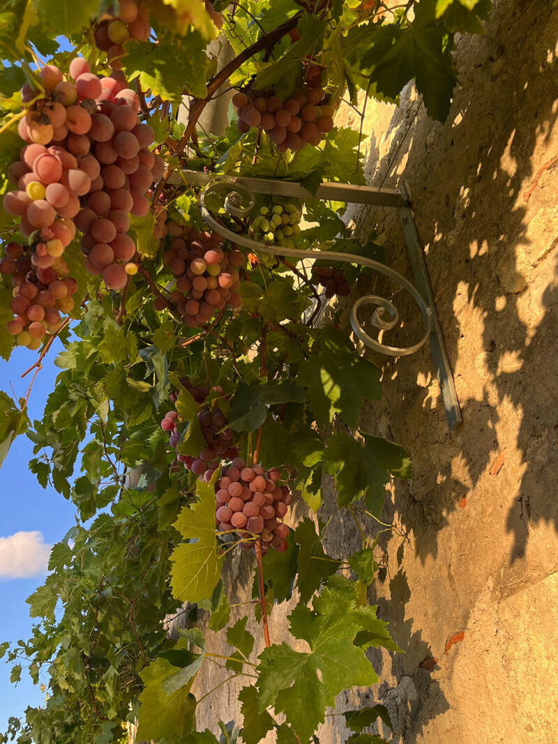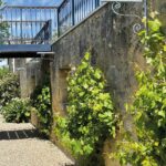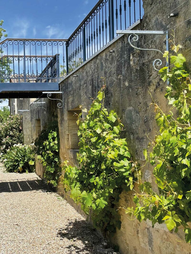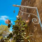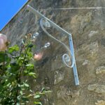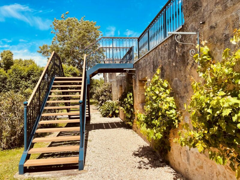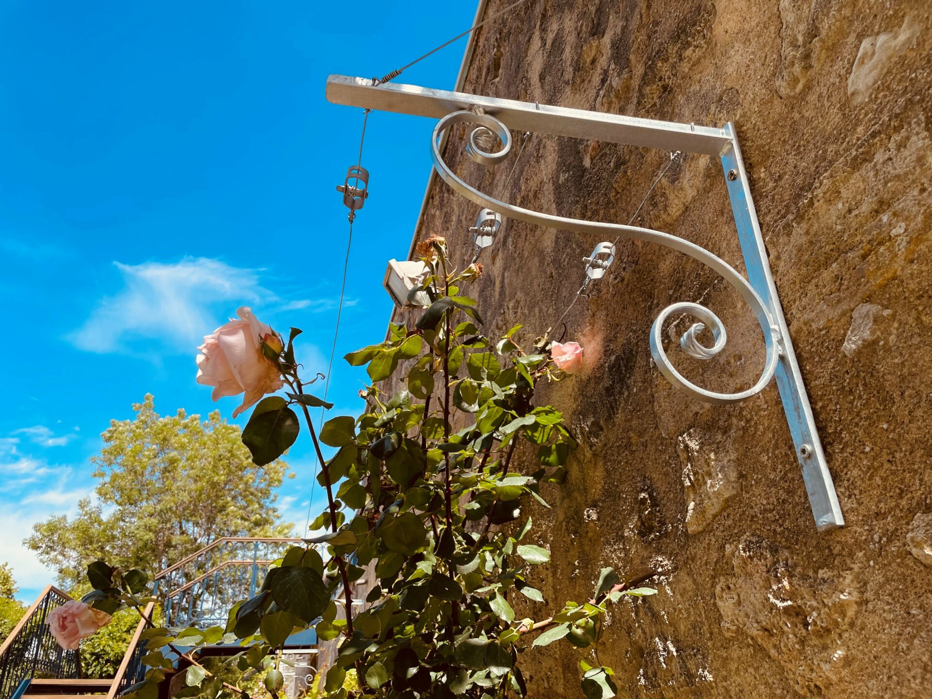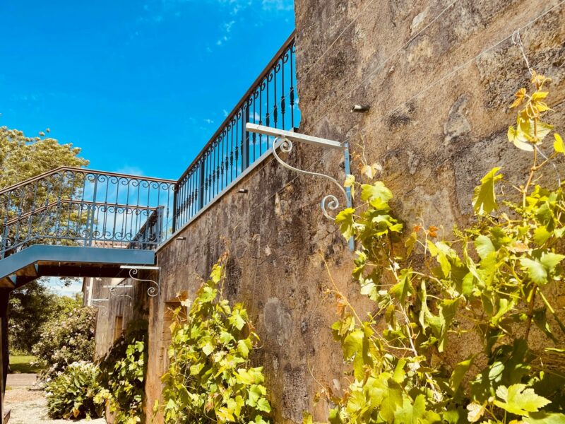 Structure en fer plat et cornière montée sur volute en fer forgé.