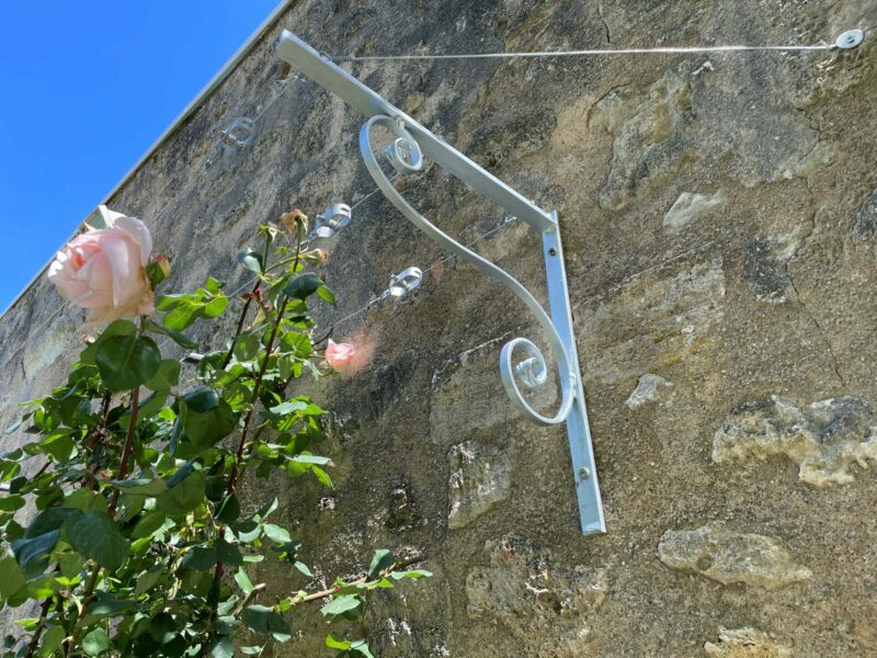 Deux perçages tête fraisée pour fixation murale et trois perçages sur traverse haute pour passage du fil de fer.
