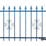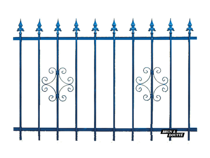 Ossature en tube carré de 40 mm, barreaudage en tube rond de 16 mm en applique sur le cadre, tôle de soubassement épaisseur 2 mm, pointes de lance en partie haute, volutes décoratives.