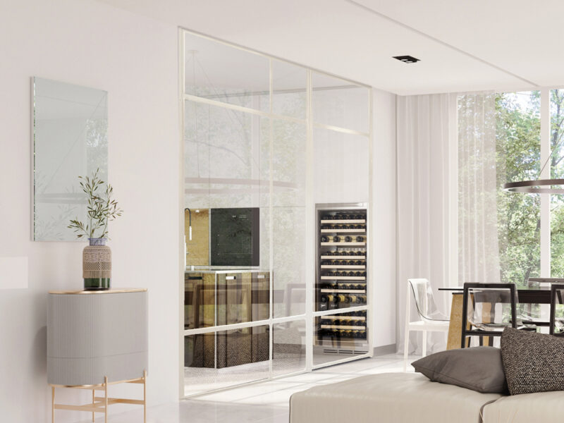 Le mécanisme permettant l’ouverture et la fermeture est facile et fluide. Structure avec châssis de renfort intégré. L’ensemble de la cloison est en acier, vitrage feuilleté clair 33.2 sécurité des personnes. Encombrement réduit après ouverture : 10 cm.