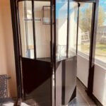 Cloison de 2 vantaux thermolaqués coulissante en accordéon. La cloison suspendue accordéon en V est fournie avec son châssis de renfort et l’intégralité de ses accessoires :