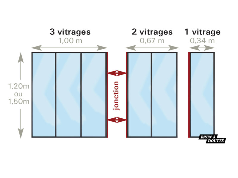 Exemple : Verrière de 5 vitrages assemblée par jonction d’un module de 3 vitrages avec un module de 2 vitrages (trait rouge).