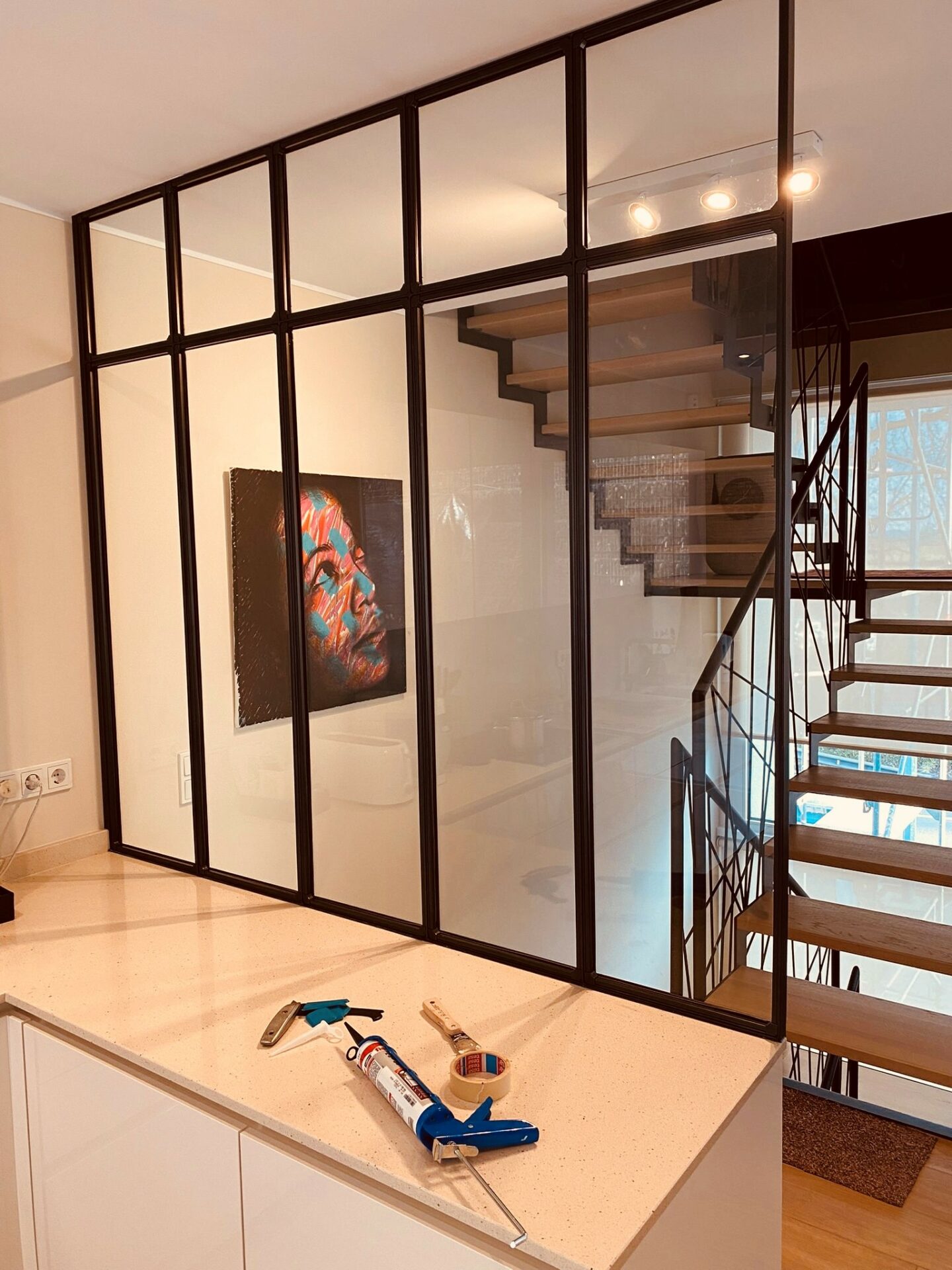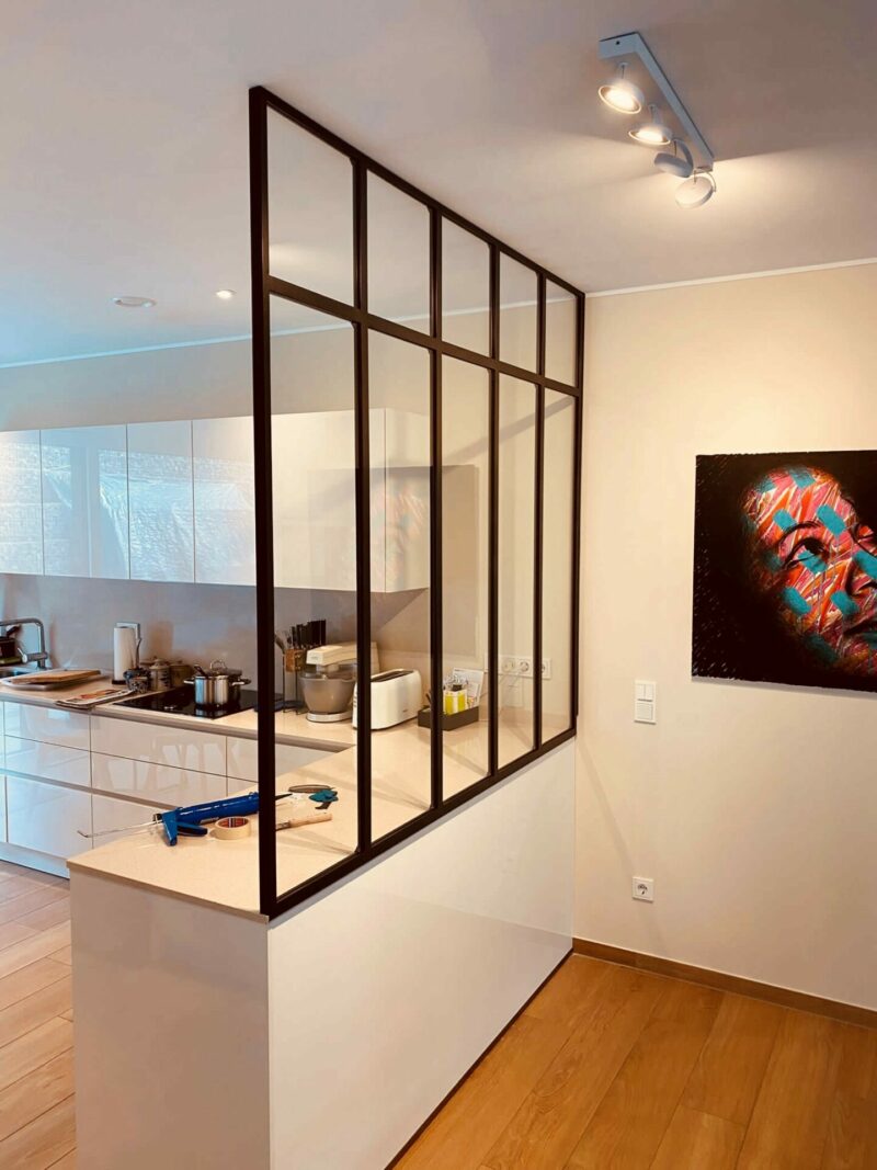 Verrière d’atelier d’intérieur traditionnelle soudée main en structure acier de 30 mm.